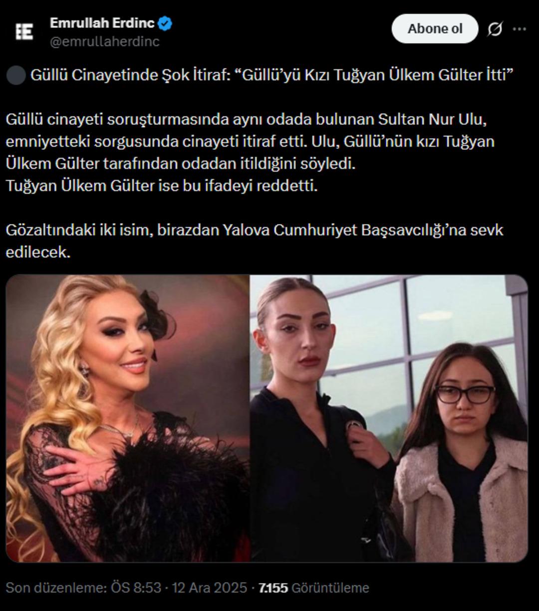 Gazeteci Emrullah Erdinç'in paylaşımına göre; olay sırasında aynı odadan bulunan Sultan Nur Ulu emniyetteki sorgusunda cinayeti itiraf etti. Ulu, Güllü’nün kızı Tuğyan Ülkem Gülter tarafından odadan itildiğini söyledi.