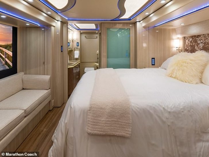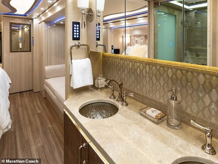 Büyük bir ana yatak odası olan otobüsün banyo ve mutfak tezgahları mermerden. Mutfakta barbekü bile var.