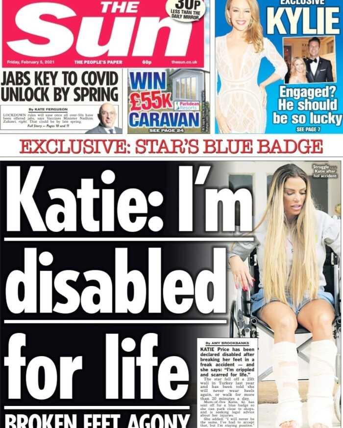 İngiliz The Sun gazetesine röportaj veren Katie Price, verdiği röportajda kendisini 'yürüme engelli' olarak kaydettirdiğini açıklarken hayatının eskisi gibi olmayacağını da sözlerine ekledi.