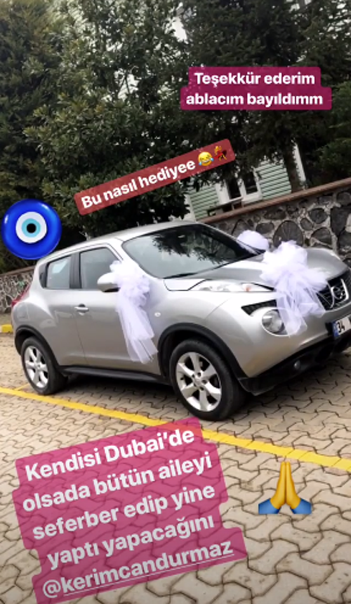 2016 yılında ablası Serap Akbudak’a Bursa’nın en işlek yerine zayıflama ve yaşam koçluğu merkezi açan Kerimcan Durmaz, bu sefer de son model gri renkli bir cip hediye etti. Kerimcan’ın bu hediyesini ablası Serap Akbudak, sosyal medya sayfasından takipçileriyle paylaştı.