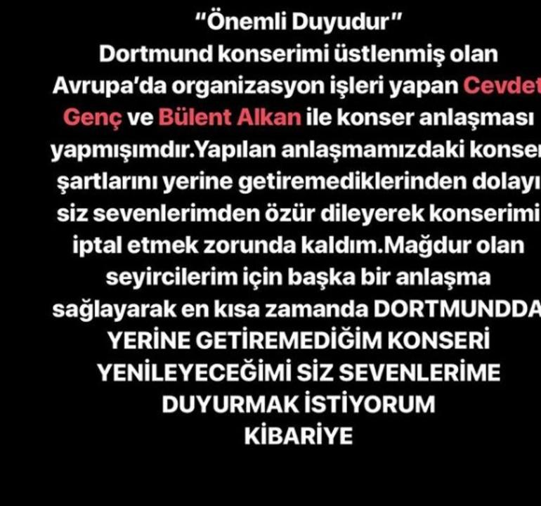 "Dortmund konserimi üstlenmiş olan Avrupa'da organizasyon işleri yapan Cevdet Genç ve Bülent Alkan ile konser anlaşması yapmışımdır. Yapılan anlaşmamızdaki konser şartlarını yerine getiremediklerinden dolayı siz sevenlerimden özür dileyerek konserimi iptal etmek zorunda kaldım. Mağdur olan seyircilerim için başka bir anlaşma sağlayarak en kısa zamanda Dortmund'da yerine getiremediğim konseri yenileyeceğimi siz sevenlerime duyurmak istiyorum."