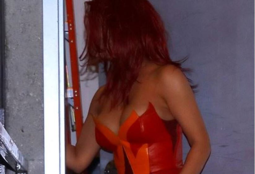 Kim, kırmızı tonlarında, vücudunu saran straplez bir tulum giymişti.