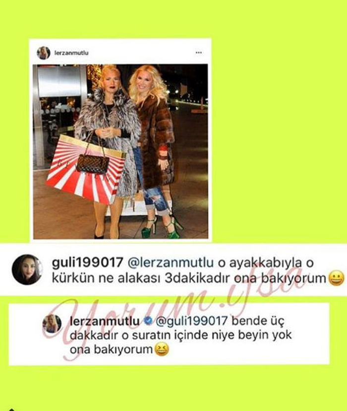 Sosyal medya kullanıcısı bir genç kız, Mutlu’nun paylaşımının altına, “O ayakkabıyla o kürkün ne alakası var? 3 dakikadır ona bakıyorum” mesajını yazdı. Lerzan Mutlu ise, “Ben de üç dakikadır o suratın içinde niye beyin yok ona bakıyorum” şeklinde sert bir cevap yazdı.