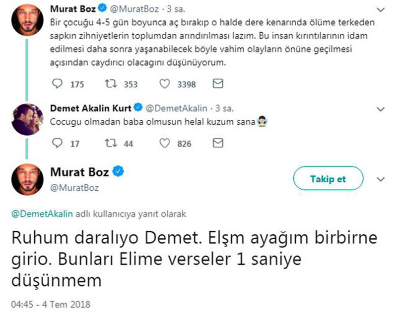 Twitter hesabından bu vahşeti yapan sapkın zihniyetlerin toplumdan arındırılmasını söyleyen Murat Boz'a, Demet Akalın şu sözlerle destek verdi: ''Çocuğun olmadan baba olmuşsun, helal kuzum sana''