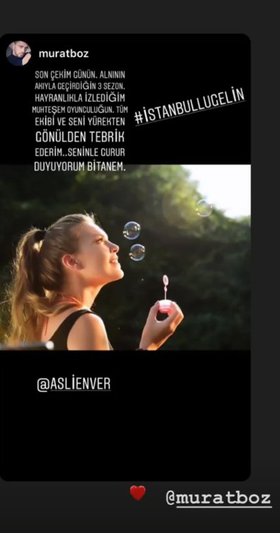 Yaklaşık 3 sezondur izleyiciyi ekran başına kilitleyen İstanbullu Gelin dizisi senaryosunun tıkandığı gerekçesiyle 31 Mayıs günü yayınlanacak son bölümüyle ekran macerasını bitiriyor. Uzun bir süredir birlikte çalışan ekip son çekim gününü de yine büyük bir heyecan ve enerjiyle çekerken, Aslı Enver sosyal medya hesabı üzerinden bu güne dair paylaşımlarda bulundu. Enver’in sevgilisi Murat Boz’a ait sözleri paylaşması da dikkatlerden kaçmadı. İşte Enver’in hesabından yaptığı Murat Boz paylaşımı: