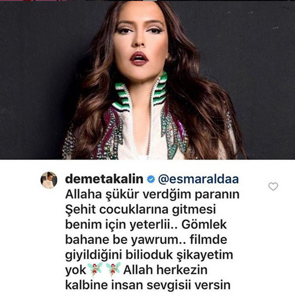 Gömleği açık artırma ile 10 bin TL'ye satın alan Demet Akalın bir takipçisinin sözleri üzerine sessizliğini bozdu ve konuyla ilgili olarak şunları yazdı: