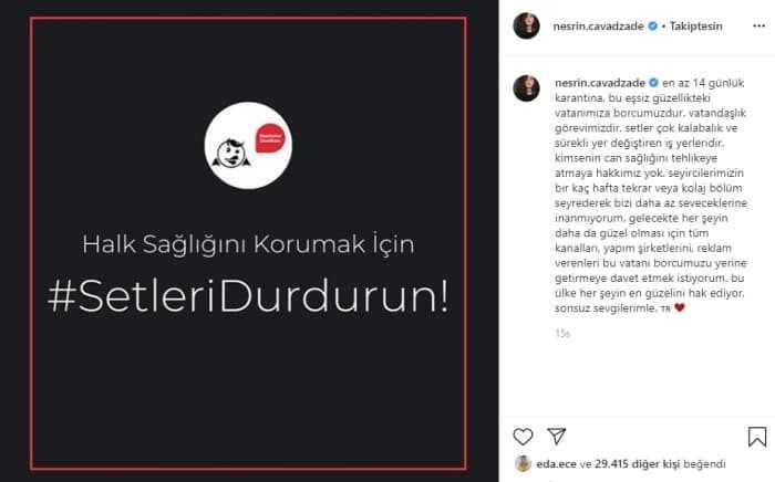 "En az 14 günlük karantina, bu eşsiz güzellikteki vatanımıza borcumuzdur. vatandaşlık görevimizdir. Setler çok kalabalık ve sürekli yer değiştiren iş yerleridir. kimsenin can sağlığını tehlikeye atmaya hakkımız yok.