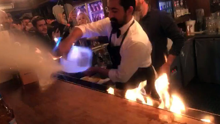 Olay dün saat 21.30 sıralarında yaşandı. Görgü tanıklarının anlatımlarına göre şöyle gelişti. Restoranın bar kısmındaki masa üzerinde iki çalışan alev şova başladı. Ancak masanın üzerindeki alevler bir anda etrafa sıçradı. Bu sırada bir çalışan, elindeki bidondan alevlerin üzerine bir sıvı döktü. Alevler daha da büyüdü.