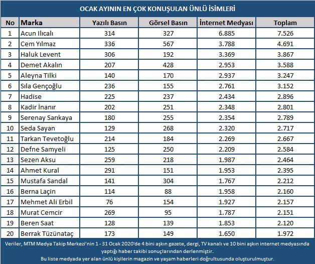 Medya Takip Merkezi (MTM), nabzını tuttuğu magazin ve sanat dünyasının Ocak ayı raporunu açıkladı.