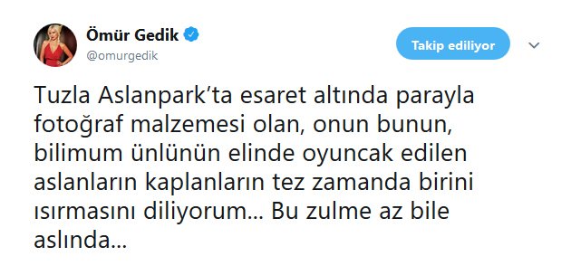 Gedik sosyal medya hesabı üzerinden yaptığı paylaşımla bu defa geride bıraktığımız yıl Ekim ayında Tuzla’da açılan Aslan Park’ı hedef aldı. Hayvan haklarının korunması amacıyla kurduğu HAÇİKO derneğinin başkanlığını sürdüren Ömür Gedik, hayvanlara yapılan kötü muamelelere karşı tepkisini tüm kanallardan gösteriyor. Hayvanlara yapılan zulme dikkat çekmek adına sosyal medya hesabını da aktif olarak kullanan Gedik son olarak Tuzla Aslan Park’ta yaşananlara dikkat çekti. Geride bıraktığımız yıl kapılarını açan Aslan Park’la ilgili paylaşım yapan Ömür Gedik şunları yazdı: