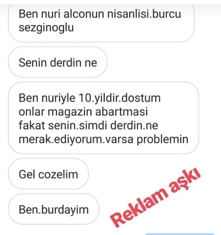 Ama kadın, benim Nuri'yle resimlerimi görünce bana özelden saldırmaya başladı.10 yıldır sevgili olmadıklarını sadece tanış olduklarını da yazdı.