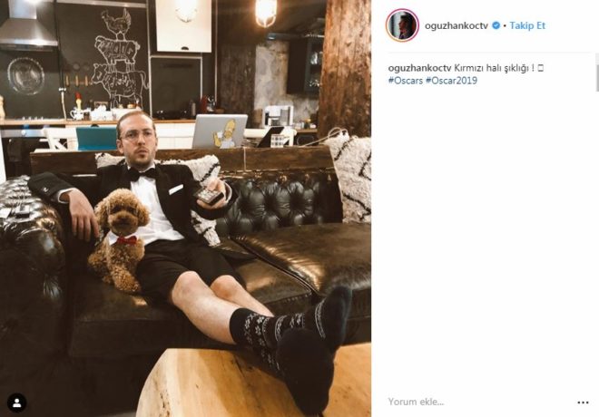 Oyuncu ve müzisyen Oğuzhan Koç da 91. Oscar Ödülleri gecesinde kırmızı halıya uygun giyinenlerdendi. Üzerine ceket, gömlek ve papyon, altına da bir şort giyen Koç, sevimli köpeği Alf ile çekildiği bir fotoğrafı “Kırmızı halı şıklığı” notuyla takipçileriyle paylaştı.