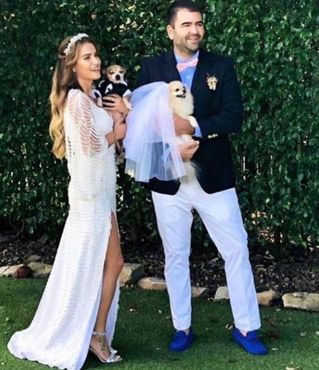 Çift, bu mutlu günlerinde köpeklerini de gelin ve damat kıyafetiyle süsledi. Damat Buğra Toplusoy'un renkli ayakkabıları ise ilgi çekti.