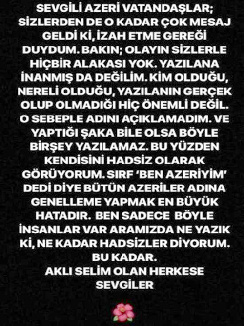Paylaşımının ardından tepkiler alan Özge Borak bir açıklama daha yaptı. Borak, kendisine tepki gösteren Azeri takipçilerine “Olayın sizlerle hiçbir alakası yok. Yazılana da inanmış değilim. Kim olduğu, nereli olduğu, yazılanın gerçek olup olmadığı hiç önemli değil.