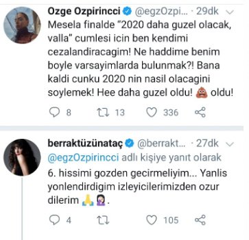 şeklinde bir yorumda bulunurken yakın arkadaşı Berraz Tüzünataç da Özpirinçici’ye söylediği sözler için: “6. hissimi gözden geçirmeliyim. Yanlış yönlendirdiğim izleyicilerimizden özür dilerim” şeklinde bir yorum yaptı.