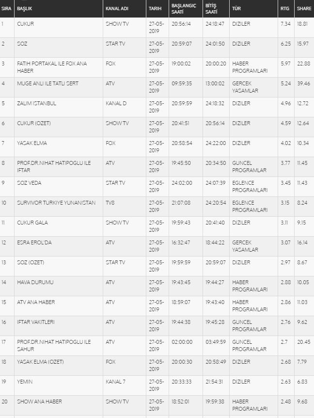 REYTİNG SONUÇLARI 27 MAYIS