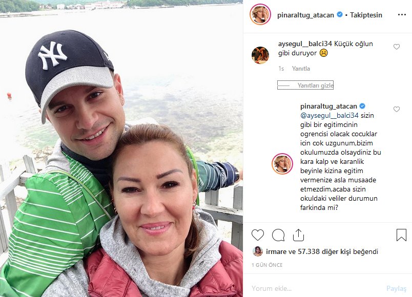 Magazin dünyasının örnek çiftleri arasında yer alan Pınar Altuğ ve Yağmur Atacan çifti her ne kadar mutluluklarını sosyal medya hesaplarından yaptıkları paylaşımlarla sürekli olarak gösterseler de kimi takipçileri bu mutluluk kokan karelere ısrarla şay yorumu yapmayı sürdürüyor. Her fırsatta bu konudan rahatsız olduğunu gösteren Pınar Altuğ buna rağmen kendisine yapılan saygısız yorumlara kayıtsız kalmıyor ve onlara tepkisini dile getiriyor. Başarılı oyuncu dün eşiyle birlikte çekilmiş olan fotoğrafın altına yapılan: “Küçük oğlun gibi duruyor” yorumuna da tepkisini gösterdi ve şunları yazdı: