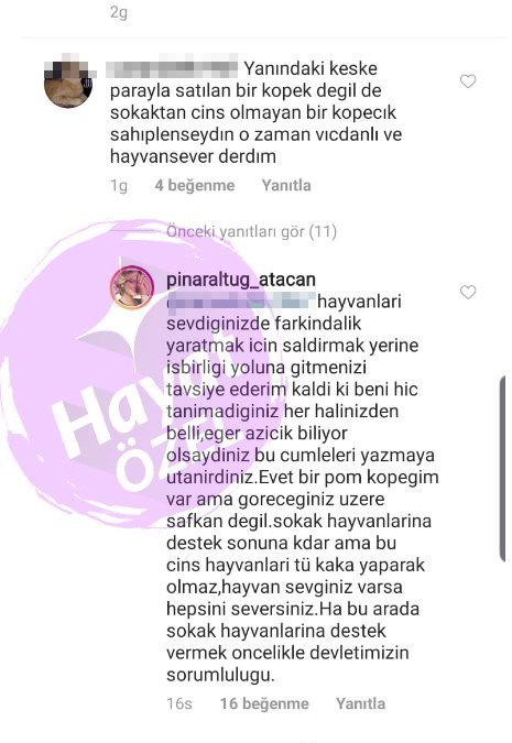 Kendisini cins bir köpek sahibi olduğu için; “Yanındaki keşke parayla satılan bir köpek değil de sokaktan cins olmayan bir köpecik sahiplenseydin o zaman vicdanlı ve hayvansever derdim” sözleriyle eleştiren takipçisine bakın usta oyuncu hangi satırlarla yüklendi.