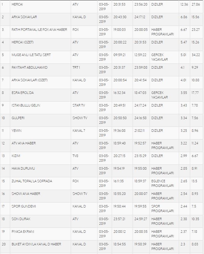 Reyting listesinde total sıralamasına göre Hercai birinci sırada yer aldı, Arka Sokaklar ikinci sırada yer alırken, Fatih Portakal ile Fox Ana Haber üçüncü oldu. Gülperi ise onuncu sırada yer aldı. İşte total reyting sonuçları…