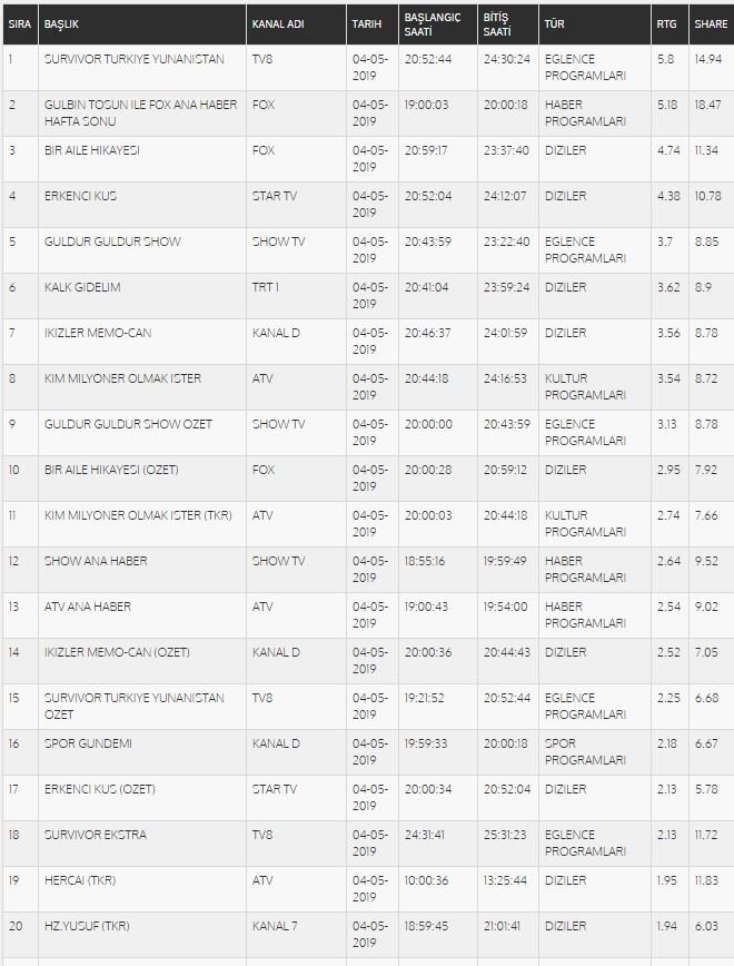 Reyting sonuçları belli oldu. Reyting sonuçlarına göre Survivor 4 Mayıs gününün birincisi oldu, total raporunda FOX Ana Haber ikinci olurken, Bir Aile Hikayesi adlı dizi üçüncü oldu. Erkenci Kuş ise dördüncü oldu. İşte total reyting sıralamasında ilk yirmi program…