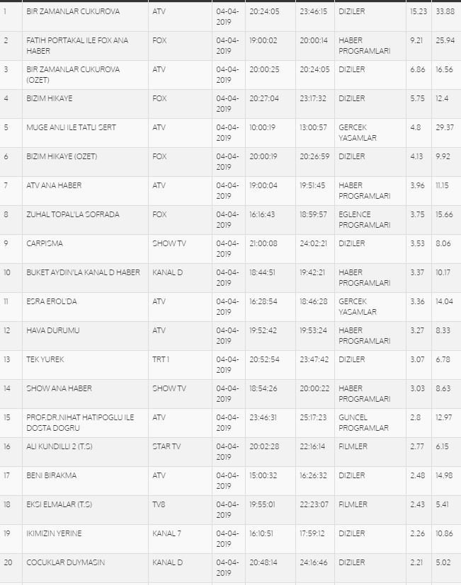 Reyting sonuçlarına göre Bir Zamanlar Çukurova birinci oldu, Fatih Portakal ile Fox Ana Haber ikinci sırada yer aldı. Fox TV'nin sevilen dizisi Bizim Hikaye reyting sıralamasında dördüncü oldu. Show TV'de yayınlanan Çarpışma ise Avlu’nun yokluğunda yükselerek dokuzuncu sırada yer aldı. Total reyting sonuçlarına göre ilk 20 sıra haberimizde.