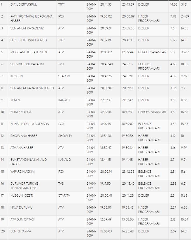 REYTİNG SONUÇLARI 24 NİSAN