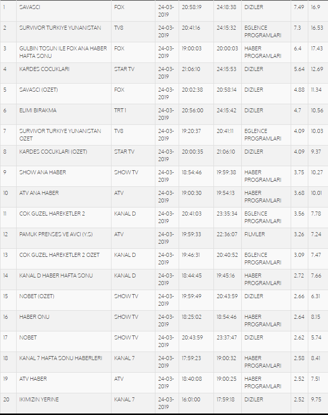 Heyecanla beklenen 24 Mart reyting sonuçları açıklandı. Dün akşam reytinglerde Survivor, Savaşçı, Kardeş Çocukları, Elimi Bırakma yarışı vardı. Peki hangi yapım ilk sırayı aldı? İşte reyting sonuçları...