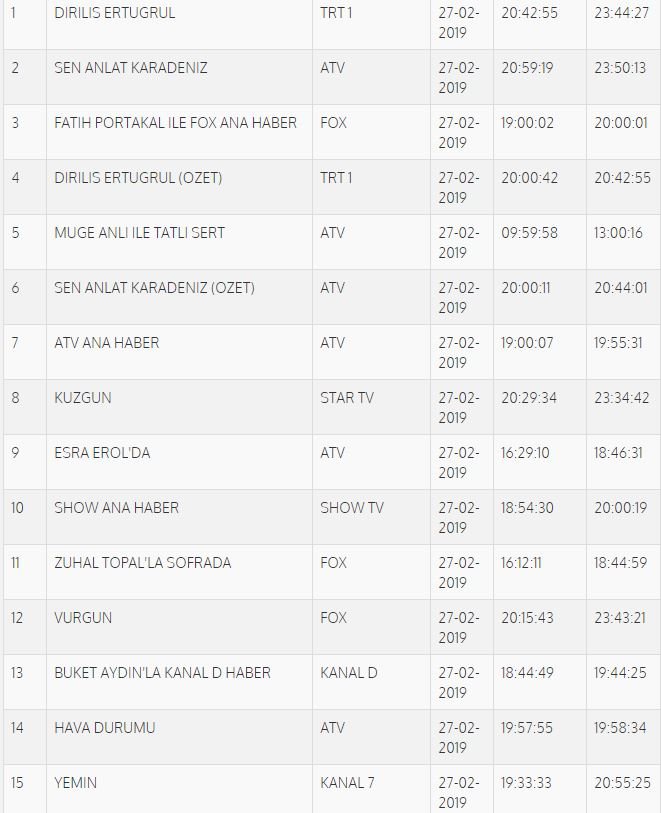 Sen Anlat Karadeniz dizisinin yeni bölümü ikinci sırada kendine yer bulurken Fatih Portakal ile Fox Ana Haber üçüncü oldu. Reyting sıralamasına göre totalde ilk beş sırada Diriliş Ertuğrul özeti ve Müge Anlı ile Tatlı Sert yer aldı. Vurgun dizisi totalde ilk beşe giremese de AB sıralamasında beşinci oldu.