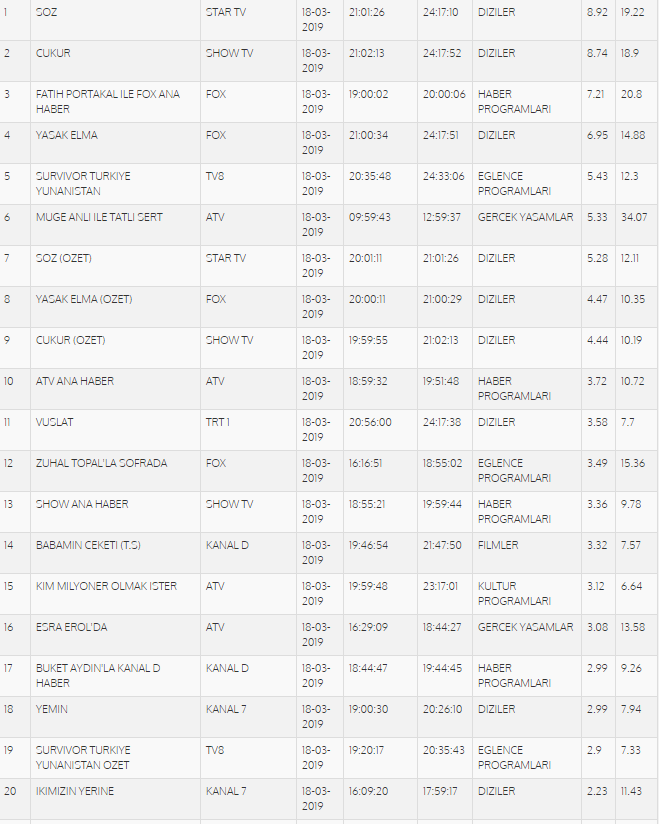 18 Mart Reyting sonuçları belli oldu ve total raporuna göre Söz dizisi birinci olurken, Çukur az farkla ikinci sırada yer aldı. Yasak Elma reyting sıralamasında dördüncü oldu. Survivor yarışma programı ise beşinci sırada yer aldı. Total bazda reytinglerde ilk yirmi sıra haberimizde.