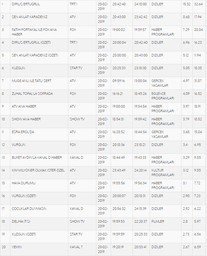 Reyting sonuçları açıklandı. 20 Şubat Çarşamba akşamı Diriliş Ertuğrul, Sen Anlat Karadeniz, Vurgun ve Kuzgun dizileri reytinglerde yarıştı.