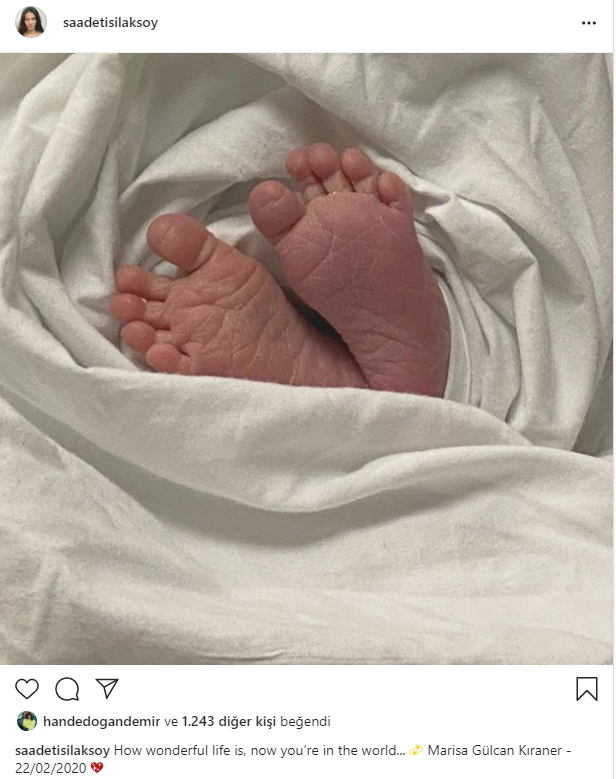 Müjdeli haberi Instagram hesabından duyuruan Aksoy, kızının ayaklarının fotoğrafını paylaşarak, "Hayat ne kadar harika, sen dünyadasın" notunu düştü. Oyuncu, paylaşımında kızının 22 Şubat'ta dünyaya geldiğini de belirtti.