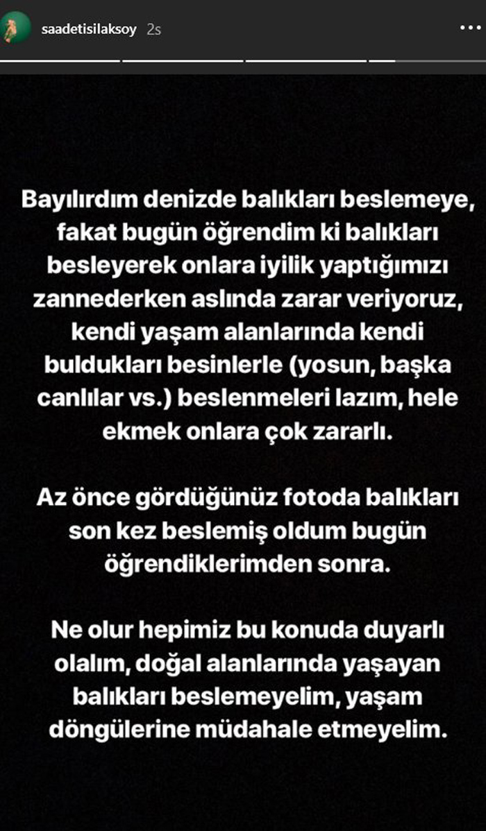 Sıcak havaların tadını çıkartarak deniz keyfi yapan oyuncu Saadet Işıl Aksoy, dinlendiği molalarda da denizdeki balıkları besledi. Ancak Aksoy, bu paylaşımı yaptıktan sonra denizdeki balıkları besleyerek onlara aslında kötülük yaptığını öğrendi ve hesabından yaptığı yanlış hakkında takipçilerini bilgilendiren ve bundan sonraki hareketleri konusunda fikir sahibi olmamızı sağlayan o paylaşımını yaptı:
