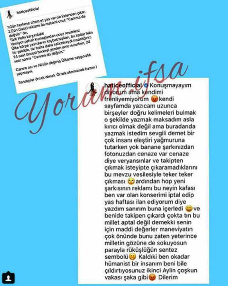 Şarkıcı Hatice, Demet Akalın'ı," Birinci gün herkese sitem et yas var de listeden çıkar, ikinci gün Gucci reklamı ile matemi unut "Canıma da değsin" de. Türk halkı karşındaki! Yemiyor pahalı kumaşlardan ucuz resimleri. Ülke körpe yavrularını kaybetmişken, bu kadar hain bir şekilde, bir hafta daha sabretseydi insanlığınız.