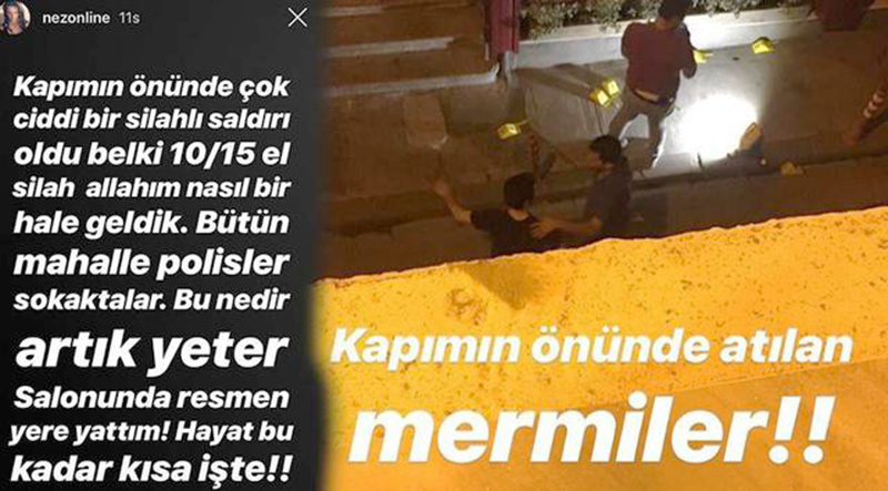 Nez, “Kapımın önünde çok ciddi bir silahlı saldırı oldu. Belki 10-15 el silah. Allah'ım nasıl bir hale geldik. Bütün mahalle, polisler sokaktalar. Bu nedir? Artık yeter. Salonumda resmen yere yattım! Hayat bu kadar kısa işte!” ifadelerini kullandı.