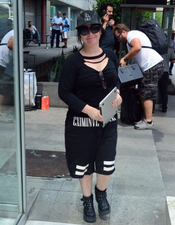 Uzun şortu, tişörtü, şapkası ve botları ile kendine has stilini gözler önüne seren rock’çı, her zamanki gibi tepeden tırnağa siyahlara bürünmüştü.