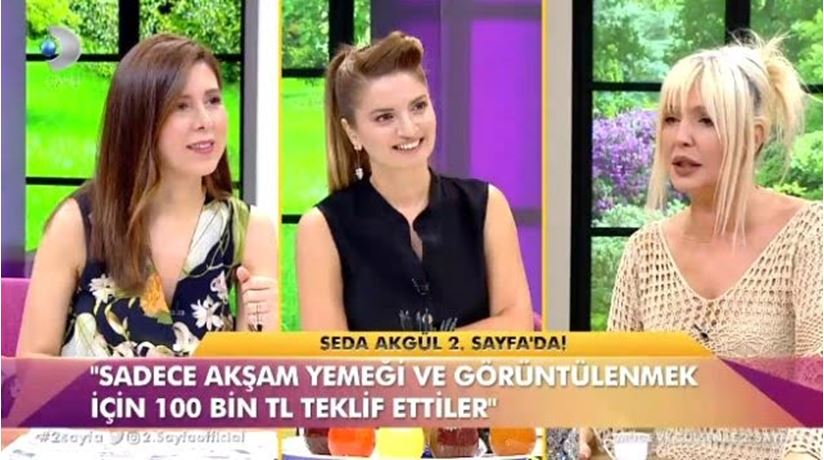 Sunucu Seda Akgül, katıldığı canlı yayında 2-3 sene önce Ankaralı bir iş adamından akşam yemeği yiyerek birlikte görüntülenmek için 100 bin TL teklif aldığını anlattı.