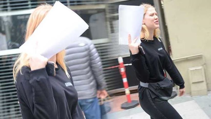Muhabirleri görünce panik olan Yereli, makyajsız yüzünü elindeki A4 kağıdı ile kapatmaya çalıştı.