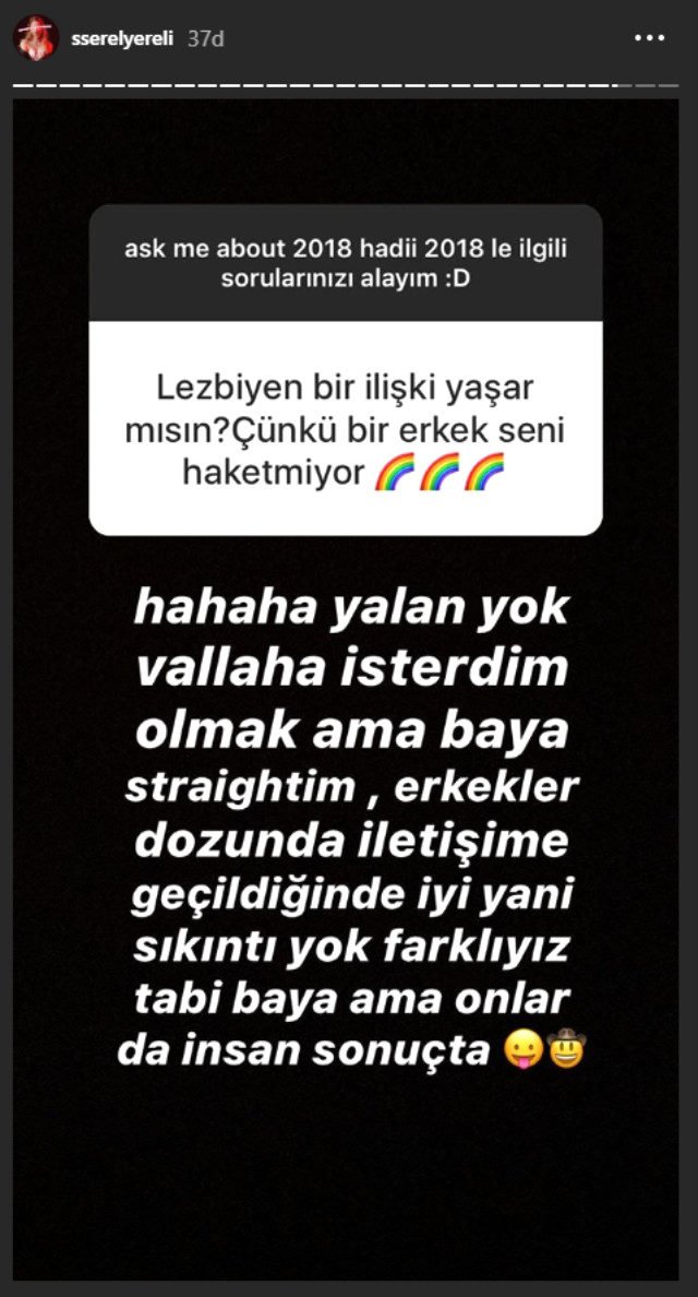 Ünlü oyuncu Serel Yereli takipçilerinden gelen 2018 yılı ile ilgili sorulara cevap verdi. Bir takipçisinin, “Lezbiyen bir ilişki yaşar mısın?” sorusuna verdiği cevap ile sosyal medyayı salladı. Serel lezbiyenlik sorusuna, “Yalan yok vallaha isterdim olmak ama baya straightim(düz), erkekler dozunda iletişime geçildiğinde iyi yani sıkıntı yok farklıyız biz tabi baya ama onlar da insan sonuçta” cevabını verdi.