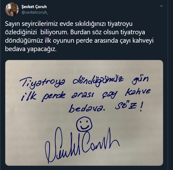 Başarılı oyuncu Twitter hesabından yaptığı bir paylaşımda şu ifadeleri kullandı: “Sayın seyircilerimiz evde sıkıldığınızı tiyatroyu özlediğinizi biliyorum. Burdan söz olsun tiyatroya döndüğümüz ilk oyunun perde arasında çayı kahveyi bedava yapacağız.”