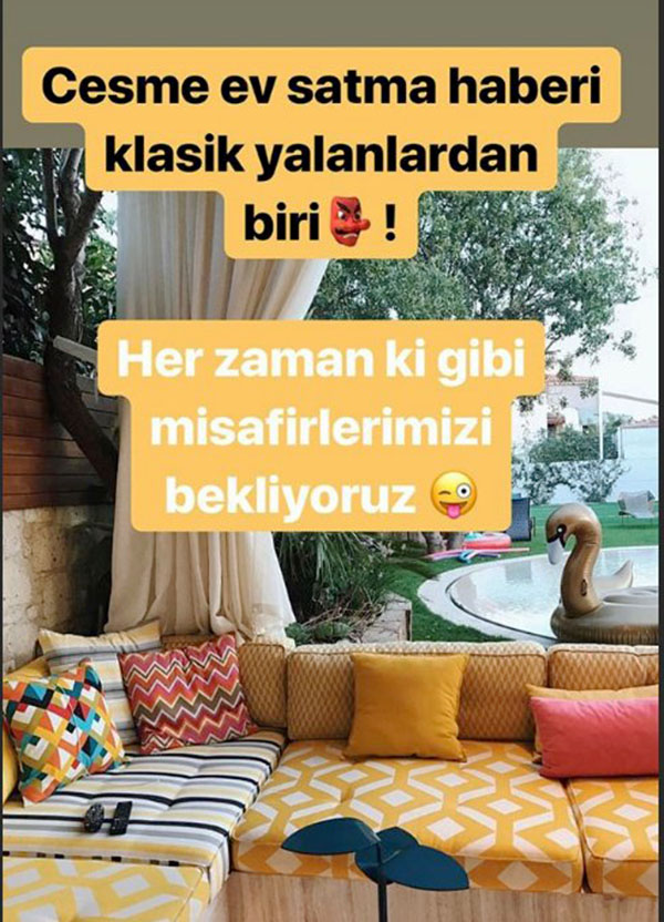 Köşe yazısı kısa sürede yayılınca konuyla ilgili açıklama Şeyma Subaşı cephesinden geldi. Evlerinin fotoğrafını sosyal medya hesabından paylaşan Şeyma Subaşı, karenin üzerine de ‘Çeşme ev satma haberi klasik yalanlardan biri’ notunu düştü.