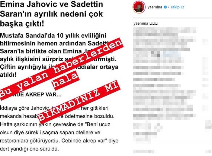 Emina Jahovic, 7 aylık ilişkisini sürpriz şekilde bitirmişti. Çiftin ayrılığıyla ilgili bugün bazı medya organlarından çıkan iddialara Jahovic, sosyal medya sayfasından yanıt verdi.