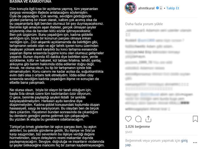 Ahmet Kural'dan yeni bir açıklama geldi. Oyuncu, "Bu olaydan ben de çok ders çıkardım. Başta Sıla olmak üzere tüm kadınlardan özür diliyorum" ifadelerini kulladı