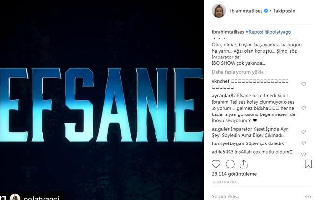 Güzel haberi sosyal medyadan duyuran İbrahim Tatlıses ve Polat Yağcı; 'Olur, olmaz, başlar, başlayamaz, ha bugün, ha yarın... Ağzı olan konuştu... Şimdi söz İmparator’da! İBO SHOW çok yakında...' mesajıyla müjdeyi verdi.
