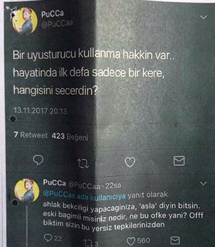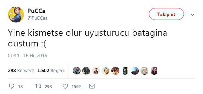 Bu tweet'lerimle uyuşturucuya özendiriyormuşum. Bir bu eksikti ya, hayatımda sigara bile içmemeşim bi şarabım vardı :(