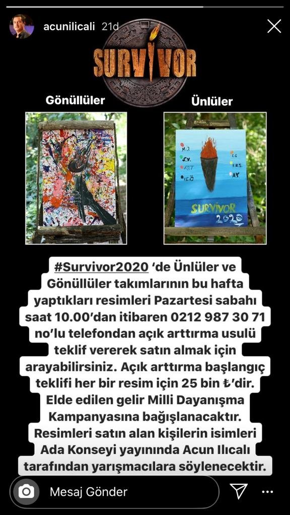 Acun Ilıcalı, ada konseyinde tanıttığı resimlerin açık arttırma yöntemi ile satılacağını duyurdu. Ilıcalı, Instagram hesabından da yaptığı paylaşımda, her bir tablonun açık arttırma başlangıç fiyatının 25 bin lira olduğunu ve gelirin Milli Dayanışma Kampanyası’na aktarılacağını duyurdu.