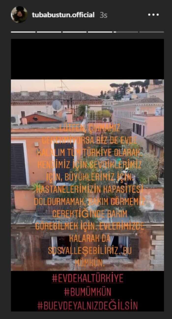 Oyuncu Tuba Büyüküstün, setlere gidiyor olunmasına karşın tedirginliğini dile getirdi. Büyüküstün, sosyal medyada başlatılan ‘setleri durdurun’ kampanyasına destek vererek yapımcıları ve kanalları sağduyulu olmaya davet etti.