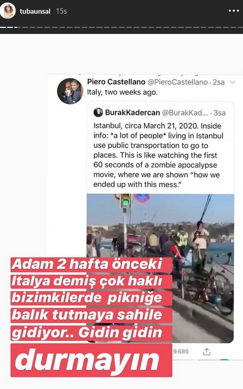İtalyan bir sosyal medya kullanıcısının İstanbul’daki sokak manzarasına işaret edip ‘İki hafta önceki İtalya’ notunu takipçilerine ulaştıran Ünsal, bu kareye “Adam iki hafta önceki İtalya demiş çok haklı, bizimkilerde pikniğe, balık tutmaya, sahile gidiyor. Gidin, gidin durmayın” notunu düştü.