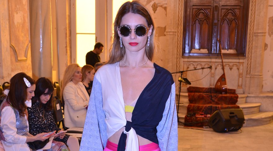 Pembe saten pantolonu ve derin göğüs dekolteli üstüyle bakışları üzerine toplayan oyuncunun defile başlamadan hemen önce salonda elindeki elektronik sigarasını tüttürmesi dikkat çekti.