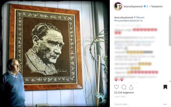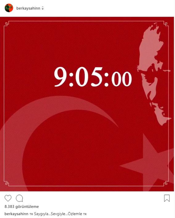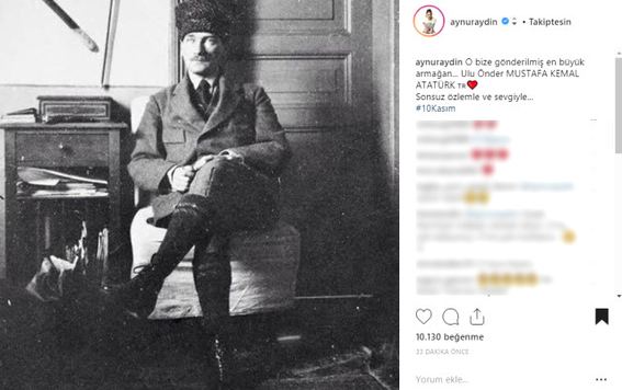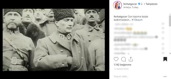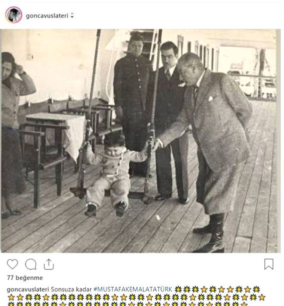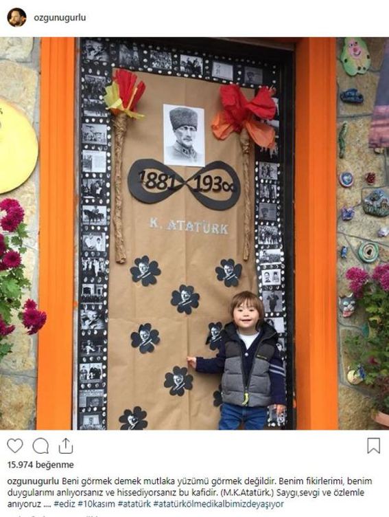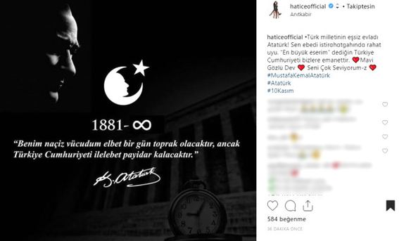 "Türk milletinin eşsiz evladı Atatürk! Sen ebedi istirɑhɑtgahındɑ rahat uyu. “En büyük eserim” dediğin Türkiye Cumhuriyeti bizlere emanettir. Mavi Gözlü Dev. Seni Çok Seviyorum/z."