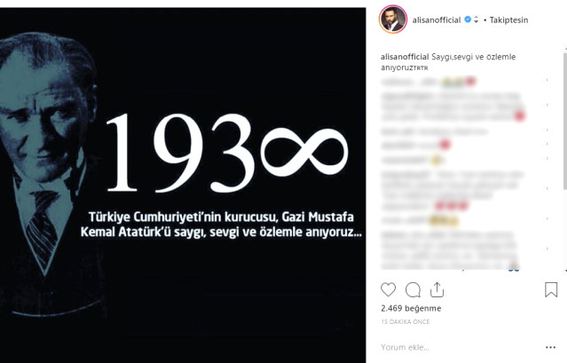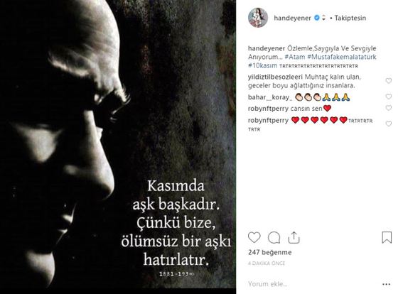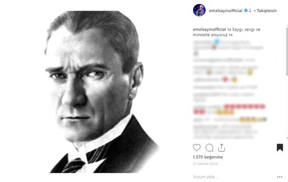 Ünlü isimler, Türkiye Cumhuriyeti'nin kurucusu Ulu Önder Mustafa Kemal Atatürk'ün aramızdan ayrılışının 80. yıl dönümünde, sosyal medya paylaşımlarıyla Atatürk'ü andı.